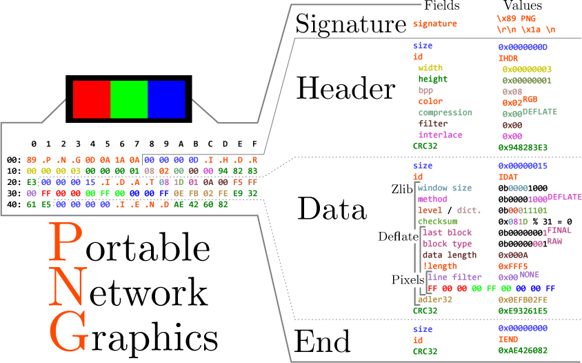 There are also ancillary chunks that give metadata to tell parsers more specifically how to parse a particular image. There are a ton of ancillary chunks built into the spec. A few we could inject data into are: